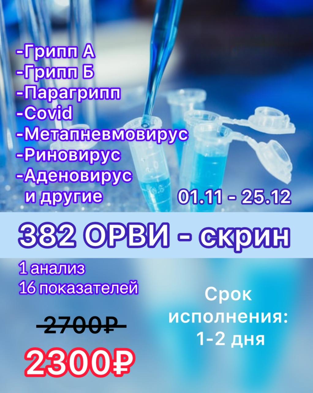 Акция: "382 ОРВИ-скрин — защити себя и своих близких!" Планируете сезон простуд или хотите быть уверенными в своем здоровье? В нашем медицинском центре вы можете пройти быстрый и точный скрининг на вирусы ОРВИ. Это поможет своевременно выявить инфекцию и начать лечение, чтобы избежать осложнений. Почему стоит воспользоваться предложением?