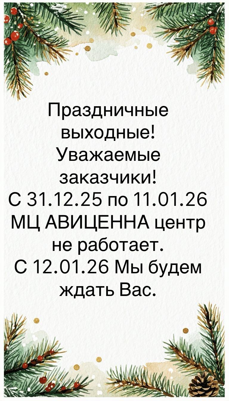 Обращаем ваше внимание, что с 31 декабря по 11 января наш медицинский центр не работает в связи с праздничными днями. Мы возобновляем работу с 12 января. Благодарим за понимание и желаем вам счастливых праздников и крепкого здоровья! | ![]() |